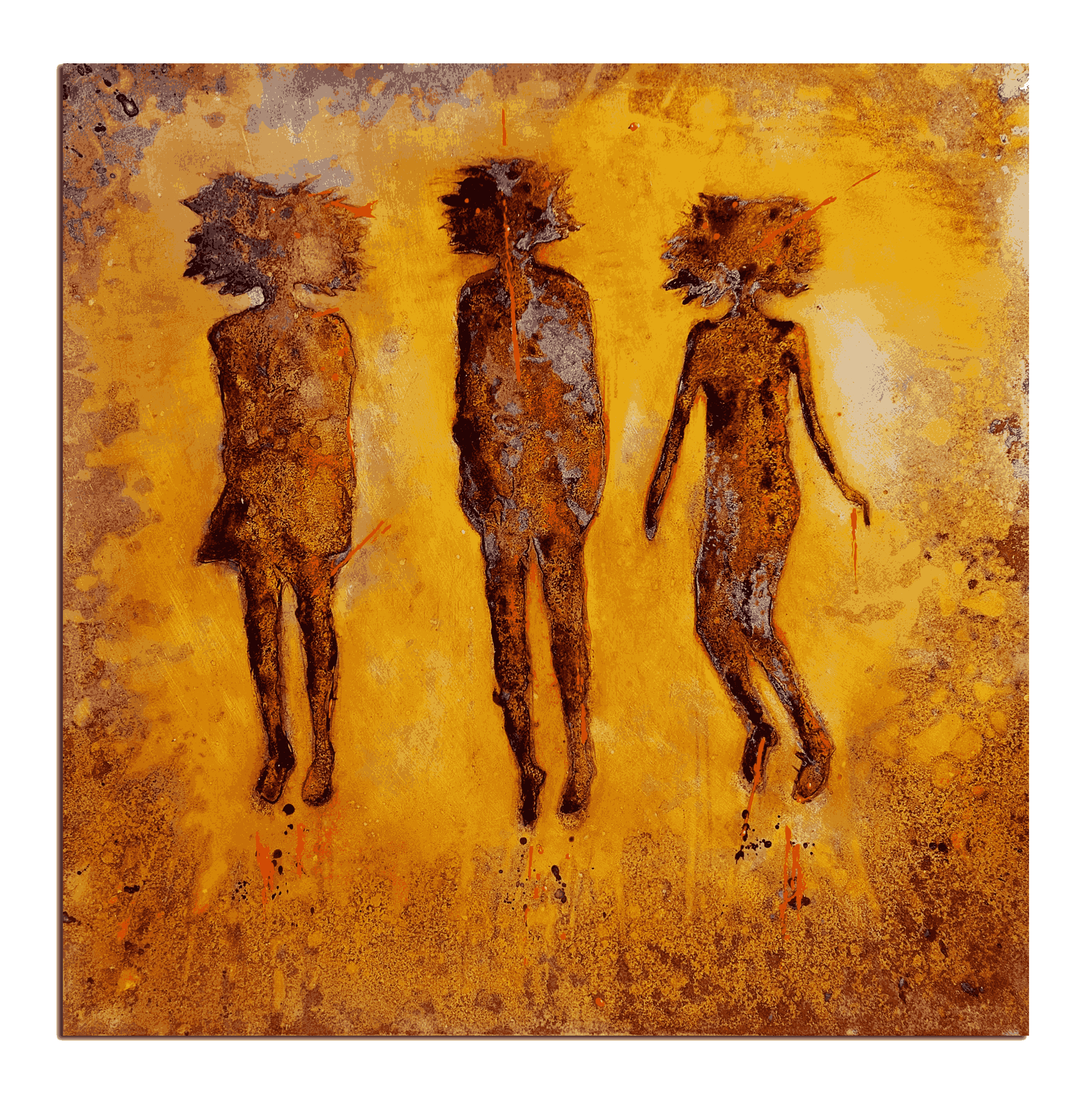 60 sites symboliques de l'histoire du monde. Sur chacun, de l'eau est prélevée — eau qui contient le temps, la mémoire, la charge de ce lieu. Appliquée sur l'acier brut, elle déclenche la rouille. La rouille fait la peinture. Ce qui était là-bas est, aussi, maintenant dans le métal. La rouille est la peinture et la mémoire.